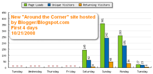 While it’s terrible to lose readers, if you subscribed via RSS feed, my feed address has not changed and you should still be able to read Around the Corner that way. In the meantime, the stats for the new Around the Corner hosted at Blogspot.com are improving, and subscriptions have improved dramatically (up to 1800 from 1403 in two days…wow! Goes to show Thingamablog just wasn’t getting the circulation it could have been!).