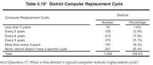- Fewer than 1/3rd of districts reported typically replacing their computers within 4 years or sooner, and more than half do not do so until after 5 years or more.