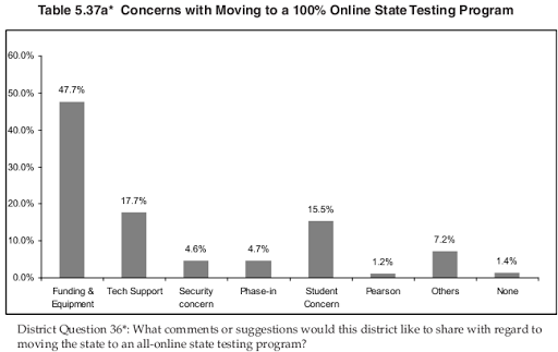 - Digital gap was perceived as being primarily attributable to student body’s socio-economic status; districts reported a belief that students from lower socio-economic families with more limited access to computers outside of school might be at a disadvantage with respect to online testing when compared with other students.