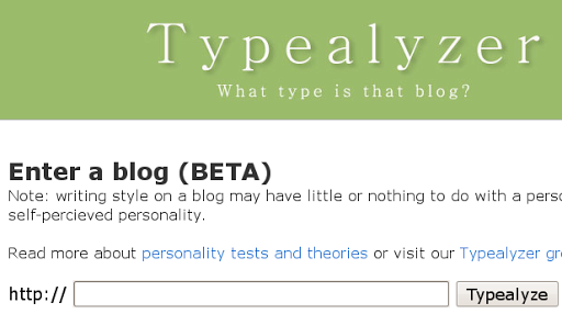 A random tweet–I was trying out my new install of Flock–took me to the Typealizer, which supposedly analyzes the writing on your blog for personality type. How does your blog score?