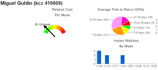 - Feedflix – find out if you’re getting your money’s worth with Netflix. You login to Netflix via Feedflix and it will print graphs and stuff to show your usage stats.