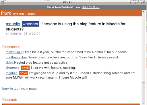 Miguel welcome to Plurk. I am glad you have decided to join and participate in an excellent PLN option. I too have been on Twitter for some time. I can respect your connections with numerous folks on Twitter but the threads will grow on you. Those reading this post that are on Twitter and want to try out Plurk consider using Twitbin as a FF3 sidebar and have Plurk in the main window. In all honesty I have developed a strong connection with my fellow Plurkers as a result of the threaded discussions and the feeling of being a “family”.