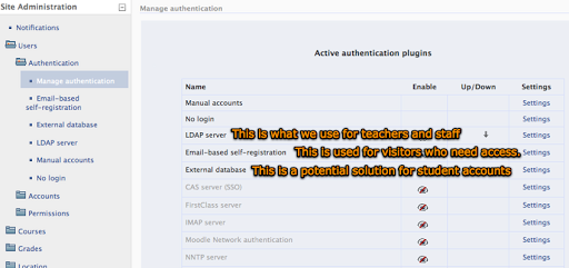 One of the options that I’m considering using is the authentication option for external databases. This would enable me to setup a MySQL database with all the student info–including the fake disabled email accounts–and students would just login with their student ID# and stock password (birth month/day, perhaps), which they would change after login.