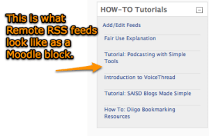 1) Remote RSS Feeds – You can run content from other places into your Moodle. This is great if you want to pull news about your school district from the local paper and display them in a sidebar, or, if you prefer, some education web site or commentary (e.g. blog).