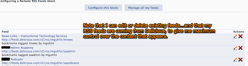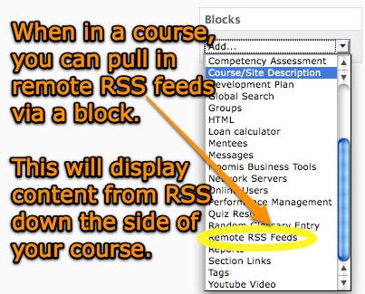 1) Remote RSS Feeds – You can run content from other places into your Moodle. This is great if you want to pull news about your school district from the local paper and display them in a sidebar, or, if you prefer, some education web site or commentary (e.g. blog).