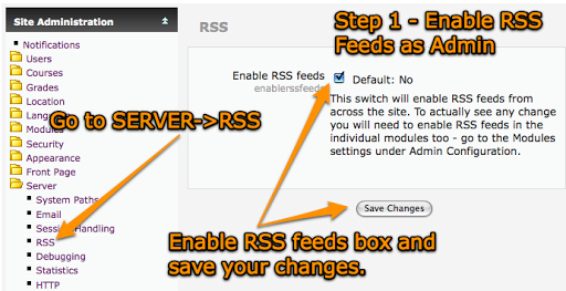 Every time I go to enable RSS feeds in Moodle, I get thrown off of where to go. I forget, so this is a tip to remind myself of how to get the job done.