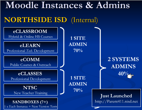 The NISD team had a system-wide approach to supporting Moodle. Often, Moodle implementations are the result of driven individuals that go out on a limb to bring the benefits of online course management to their organization without real support or understanding from others. This is a problem because people just don’t get it and the individual is left to implement a program that really requires LOTS MORE SYSTEMWIDE resources than originally imagined. At some point, you have to come back and ask, “How are we approaching this implementation now that we’re beyond the ‘proof of concept’ stage and have support?” I suppose, being strategic here is critical to future success. Amanda’s preso really speaks to this!