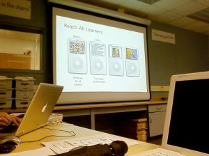Kids listen to media technology and TV and their peers. If you have students create material for iPods, they’re more likely to listen to their peers than they are their teacher.