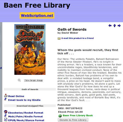 Baen Books is now making available — for free — a number of its titles in electronic format. We’re calling it the Baen Free Library. Anyone who wishes can read these titles online — no conditions, no strings attached. (Later we may ask for  an extremely simple, name & email only, registration. ) Or, if you prefer, you can download the books in one of several formats. Again, with no conditions or strings attached….