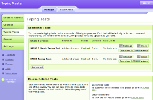 Software: TypingMaster for LMS with agreed use of two typing tests only (no typing courses)
