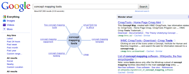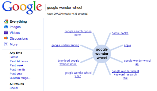 Over on the left-hand side of the screen, you’ll see the words “Wonder Wheel.” Click on WonderWheel and you’ll get the results in a concept map…note that the google results appear down the right hand side: