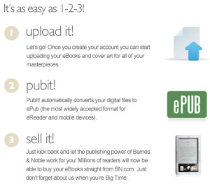 Barnes and Noble’s new service–PUB IT–offers us all a great opportunity–to take our writing and publish it to a listening audience. While there are many tools available now to get that job done (you can probably make your own list of ePublishers), seeing the possibilities open up on Barnes and Noble was gratifying:
