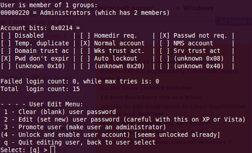 - Install chntpw (at the terminal, type “sudo apt-get install chntpw” without quotes), then