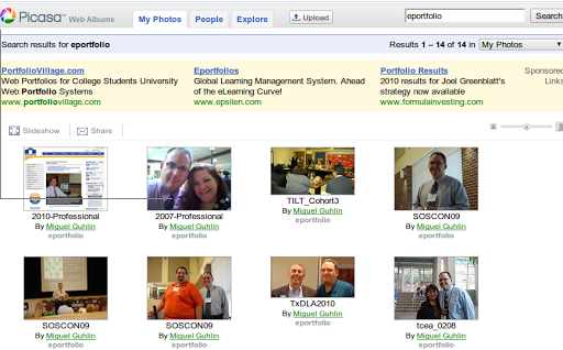 While sprucing up my ePortfolio site earlier tonight (which is housed in Google Sites now), I wondered how I might pull pictures in PicasaWeb–tagged with “eportfolio”–into a slideshow I could display on the site.