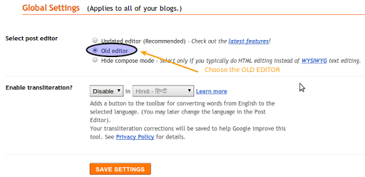To switch back, go to SETTINGS–>BASIC in blogger, scroll all the way down to GLOBAL SETTINGS, and choose OLD EDITOR…