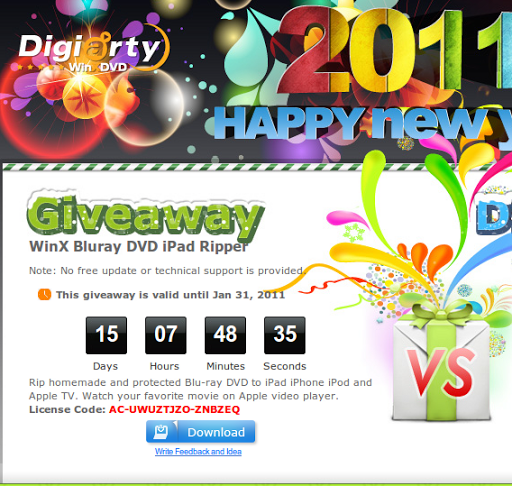 Subject: [Press Inquiry]WinX Bluray DVD iPad Ripper Upgrade and GiveawayGood day!I am pleased to tell you that our company has released WinX Bluray DVD iPad Ripper 4.50 with remarkably improved functions. To let users benefit from our new features at first time, now we are giving away this software (Original $29.95) to all users. We would be highly appreciated if you could share this giveaway information with your readers.About WinX Bluray DVD iPad RipperIt is an all-round Blu-ray Disc and DVD to iPad converting solution which is specialized in ripping Blu-ray and DVDs to iPad, iPod, iPhone, Apple TV. The latest version is strengthened with advanced Blu-ray ripping engine, featuring No.1 fast speed to rip and convert both homemade and AACS protected Blu-ray. Moreover, it adopts the unique Blu-ray reader cache technology that helps prolong the lifespan of Blu-ray devices.Giveaway page: http://www.winxdvd.com/dvd-to-ipad/Duration: from now to Jan 31, 2011License Code: AC-UWUZTJZO-ZNBZEQBest Regards,