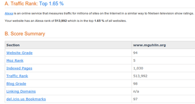 Compared to Angela’s site, which scored a 99 on her web site grade, I don’t feel too badly with a 94, given that Alexa scored ATC higher. But since this is pointless navel-gazing, who cares?