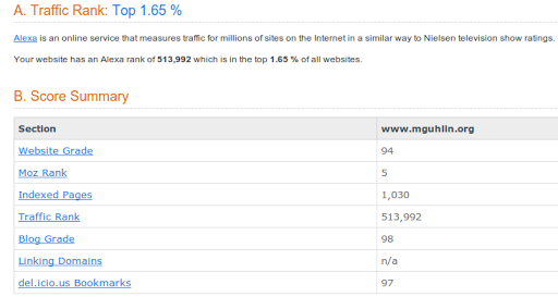 Compared to Angela’s site, which scored a 99 on her web site grade, I don’t feel too badly with a 94, given that Alexa scored ATC higher. But since this is pointless navel-gazing, who cares?