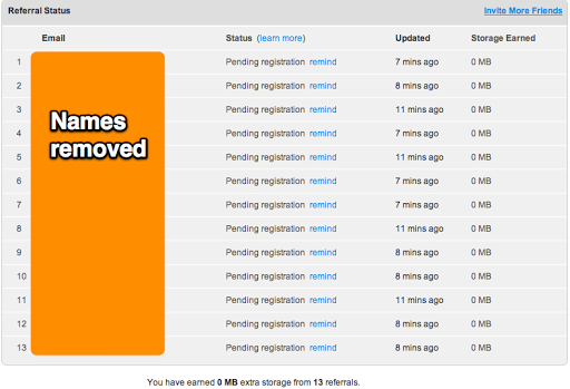 - You get 500 megs free space for each referral to 250 megs with Dropbox