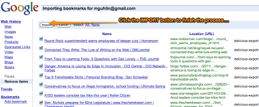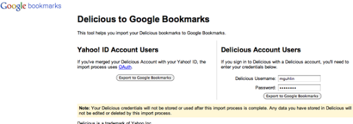 1) Go to the Delicious Bookmarks Import page on Google Bookmarks