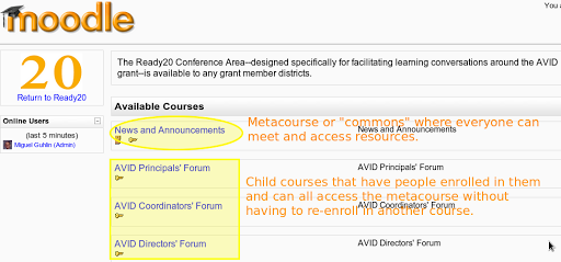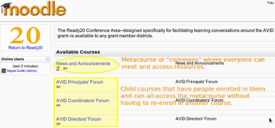 Essentially, the question is how do metacourses work for us as educators? My first contact with metacourses came about with Amanda Hefner’s work in Northside ISD. You can use metacourses as a way to setup document repositories, social topics that allow various courses to connect in one place–without having to re-enroll in yet another course.