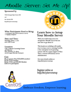 A CentOS 5.6 Server Install Fest – ie, BYOLB – Build Your Own Linux Box.OS + Webmin + Moodle + config and scripts. Limit of 10 participants. Participants bring their own Linux compatible server (with Keyboard, Monitor, Mouse + net cable) for development or production. Installation will be done over the network. Server participants bring (model/specs) to be Red Hatcertified. Please see https://hardware.redhat.com/index.cgi for compatibility guide (use the link for version 5)
