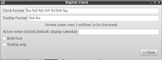 For example, the first was as simple as adjusting the way time was displayed on the screen. I wanted date and time to appear. To get the following to appear, I typed in %a %d-%b-%Y %H:%M in the digital clock settings window: