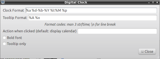 For example, the first was as simple as adjusting the way time was displayed on the screen. I wanted date and time to appear. To get the following to appear, I typed in %a %d-%b-%Y %H:%M in the digital clock settings window: