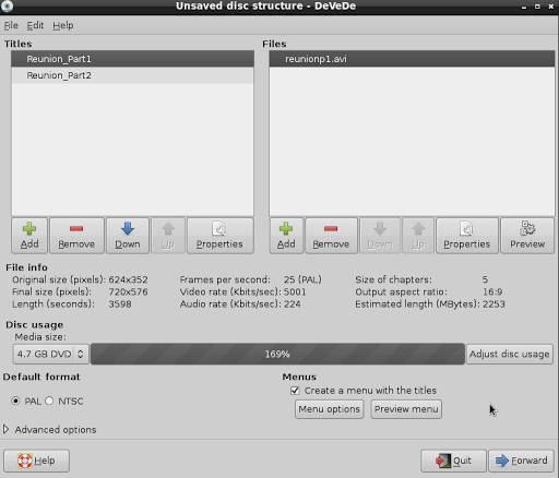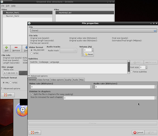 Success in this case involved DeVeDe creating a Video DVD ISO file that I could then use a program like Gnomebaker or K3b to burn to DVD media. It worked flawlessly in preparing the file. One of the neat features was the “Adjust disc usage.” The two videos I had to put on ONE DVD ended up being larger than the 4.7 gig DVD I had to burn them on. After I clicked the “Adjust disc usage” the video files were adjusted to fit on the DVD media…I have no idea how I would have made the adjustment otherwise, so I’m glad it took care of that for me!