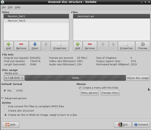 Overall, DeVeDe made the process of burning AVI to DVD media quite painless. Rendering took about 52 minutes, burning to media about 19 minutes at 2x (speed).