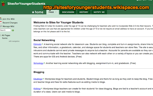 I just created a wiki users can add any sites that would be appropraite for students under 13 years old can use. Please provide a link to the site and a brief description of the site. I added two social network and two blogging sites to get things started.