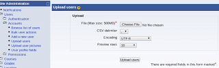 2. Do a bulk import of users into the Moodle. To accomplish that, I took a data file with all our users and relabelled column headers (using Filemaker Pro first, then doing column edits in Excel) so that I could import information that would look like this: