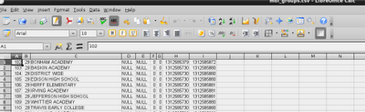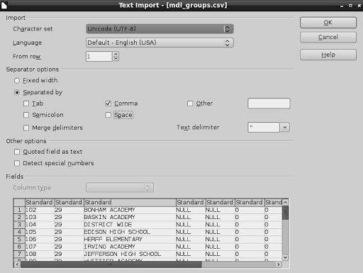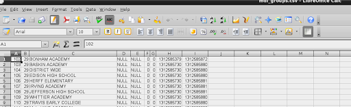 Then, I exported the mdl_groups table as a CSV file I could open in LibreOffice (or MS Excel for those of you still using that). First, I imported it:
