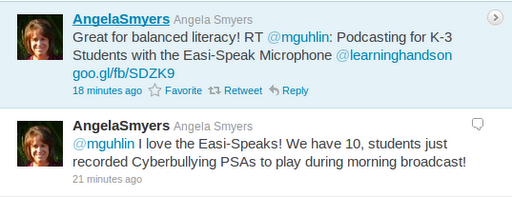 When first checking out the Easi-Speak, what impressed me–aside from recording directly to MP3, the easy off/on button, the simple recording/playback controls–was the audio playback. I immediately compared it to an Olympus Digital Voice Recorder that I like to carry around ($31). The simplicity of the controls make the little silver and blue Easi-Speak recorder a solid product for use with K-5 students. The only drawback in my mind is the 4 hour duration to the charge time, no indicator as to how much battery is left.