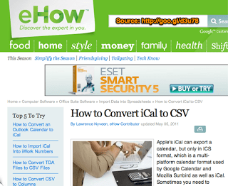 It’s kinda neat to be referenced online, such as eHow. The article–whose title appears above as How to Convert iCal to CSV–references a blog entry I wrote some time ago. Here’s the lead from that blog entry: