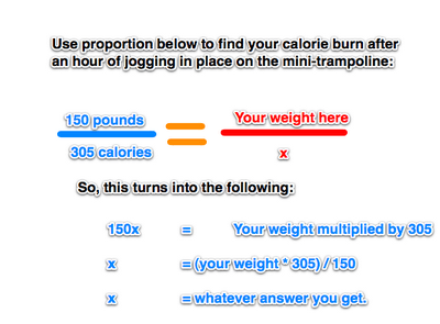 What?!? I was shocked that I could burn more calories jogging on a mini-trampoline in my house–while watching TV–than somebody jogging outside in the Texas weather!  I decided to verify and do the math, and sure enough, the Calories Burned Activity Calculator confirmed it. Of course, you can also do this with a simple proportion–which is one of the many valuable concepts that actually stuck to my brain in math class–like the one shown below that allows you to “solve for x”: