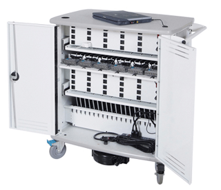 The IT40 is the first cross-platform solution to charging and storing up to 40 iPads®, e-readers, or a variety of tablets in one cart. Designed for easy cord management in a multiple iPad® sync, the IT40 helps keeps tablets organized by safely nesting tablets along two rows of padded shelves with unobstructed access for easy plugging and unplugging of cords.