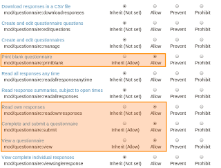 - Well I don’t have much experience of Questionnaire in 2 but in 1.9 you need to give guests permission to complete a questionnaire so I would say – go to the Settings block for your questionnaire and click Permissions and ensure you have allowed (with a +) guests to complete a questionnaire. YES I HAVE.