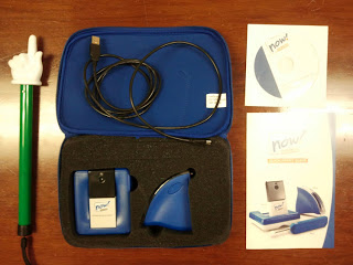 HARDWARE The hardware–shown in the image below, excluding the project and computer–that comes with the nowBoard! package is nicely contained in a small nylon-looking bag. The components themselves–wand, triangular stylus, camera (laser pointer)–are made of plastic and appear durable. At the end of the review, when I was putting the components away in the bag, I dropped the stylus about 5 feet to a tile floor. The clear plastic piece snapped out, but was easy to snap back in. When I tried the components in tandem, they worked fine. I decided not to drop any of the other components, but of all, the stylus seemed the most vulnerable and it survived handily.