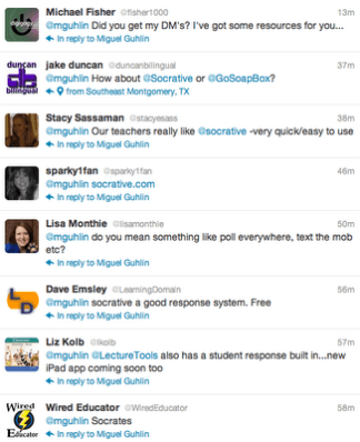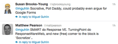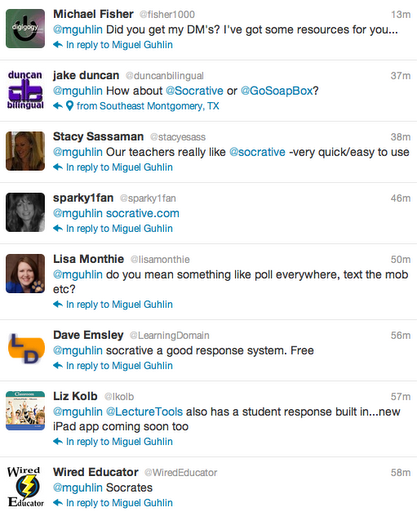 To help my teammate out, I sent out a tweet, “What r some Web based student response systems that use mobile devices, Web, etc?” The responses came back fairly quickly and I’m grateful to my PLN for their promptness.