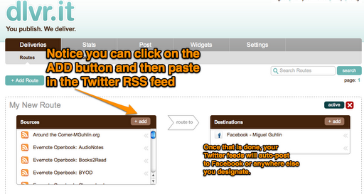 What’s neat about this approach is that you can easily blend in multiple RSS feeds–say, maybe pull in twitter accounts for all teachers at your school and run them through ONE instructionally-focused Twitter or Facebook account for your school–to form ONE RSS feed for content. Using these simple techniques, you could also deliver content in a variety of ways to blogs, wikis, etc.