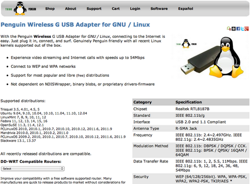 After taking care of that, we tried to figure out how to connect her desktop computer located downstairs to the wireless network–based off a Linksys Wireless-G router located upstairs. To accomplish that, I’m recommending purchase of a Penguin Wireless G USB Adapter…not only does it work with Linux, but also comes with Windows drivers!