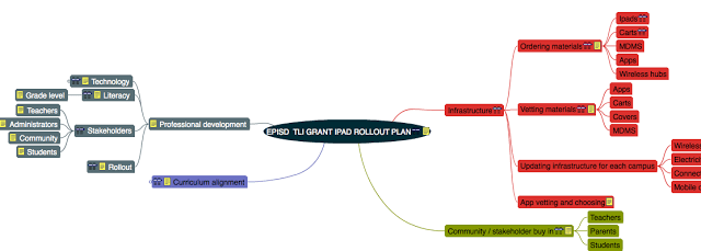Resources:Administrators,Campus administrators,Instructional Technology,Network administration,Staff Development,Technology services,Tim HoltHow do we rollout the materials for the grant? Large group? No training no iPads?