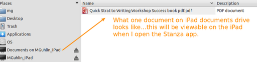 What I like about this is that I’m able to leave my Macbook in the bag, and plug into my LubuntuLinux machine, and load new books (e.g. ePub) and documents (e.g. PDFs) into Stanza’s Documents directory on the mounted Documents drive via PCMANFM (file manager).