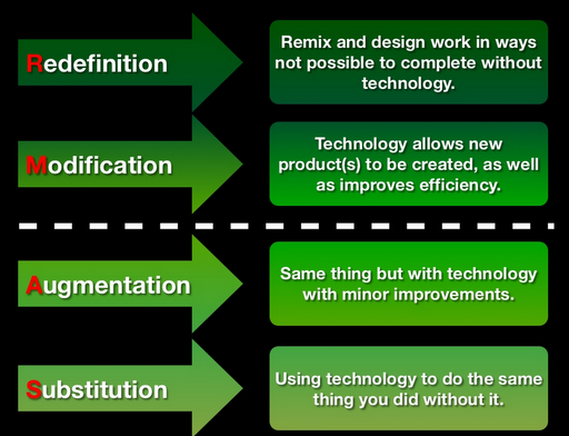 However, becoming aware models like SAMR, using those in the classroom does restore power to the teacher. Perhaps, not the power to stop the technology from coming into the classroom, but find a way to more authentically engage students with it.