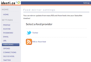 Another neat point about Identi.ca is that–unlike Plurk–you can feed content into it via RSS feed (as shown above). That means, you can have your Identi.ca account subscribe to a blog or RSS feed, and that content gets auto-posted to your Identi.ca account, which in turn can post content to lots of other places (e.g. Twitter, Facebook). Unfortunately, Identi.ca can’t handle Evernote, Google+ or custom RSS feeds…just the easy stuff.