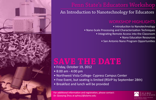 Take advantage of a free NanoTechnology workshop for Educators being held at the Northwest Vista College – Cypress Campus Center in San Antonio, Texas! You can still RSVP!