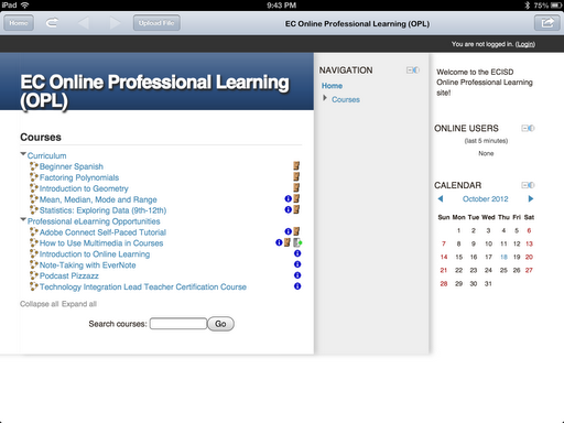 3) Traditional Course/Learning Management System: My recommendation is Moodle, although there are other solutions like Blackboard (which absorbed Angel Learning and WebCT), Instructure’s Canvas.  Traditional LMSs are still developing support for the iPad because the iPad doesn’t work like a regular computer; you don’t save files to your hard drive then upload them to the LMS.