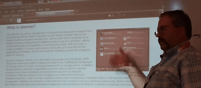 | Bill Long (Harper ISD) shown above discussing UberMix.org, a Linux distro for schools. Email: blong@harper.tx.ed.net |