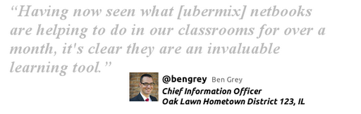 - Ubermix.org – The ubermix is an all-free, specially built, Linux-based operating system designed from the ground up with the needs of education in mind. Built by educators with an eye towards student and teacher empowerment, ubermix takes all the complexity out of student devices by making them as reliable and easy-to-use as a cell phone, without sacrificing the power and capabilities of a full operating system. With a turn-key, 5 minute installation, 20 second quick recovery mechanism, and more than 60 free applications pre-installed, ubermix turns whatever hardware you have into a powerful device for learning.